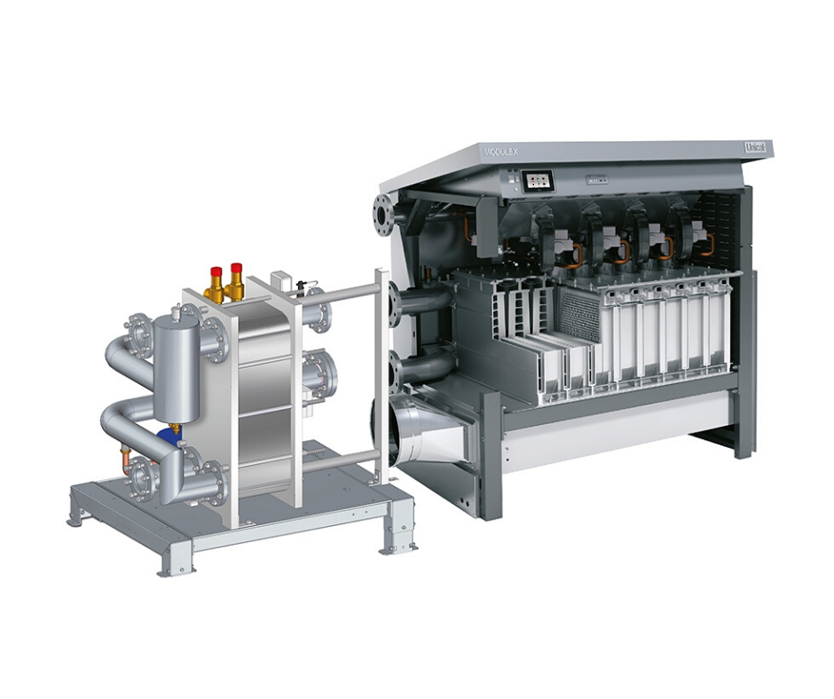 Два або чотири первинні теплообмінники зі сплаву Al/Si/Mg, відповідно до моделі, повністю зрошувані, ультракомпактні з високою циркуляцією води (гарантія 5 років)